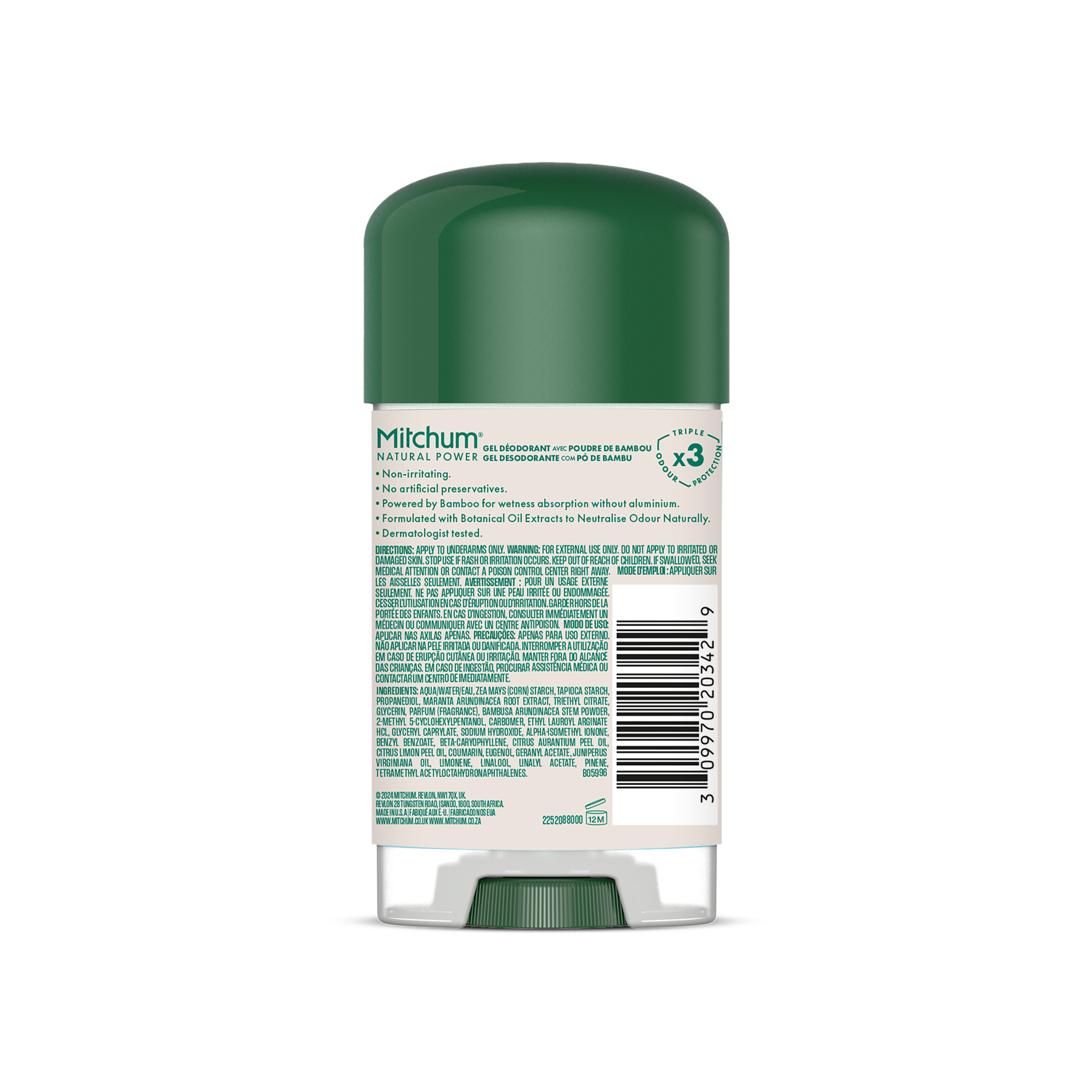 Mitchum Natural deodorant with 24 hours protection, 0% aluminium and 96% naturally derived ingredients. Powered by bamboo for wetness absorption.